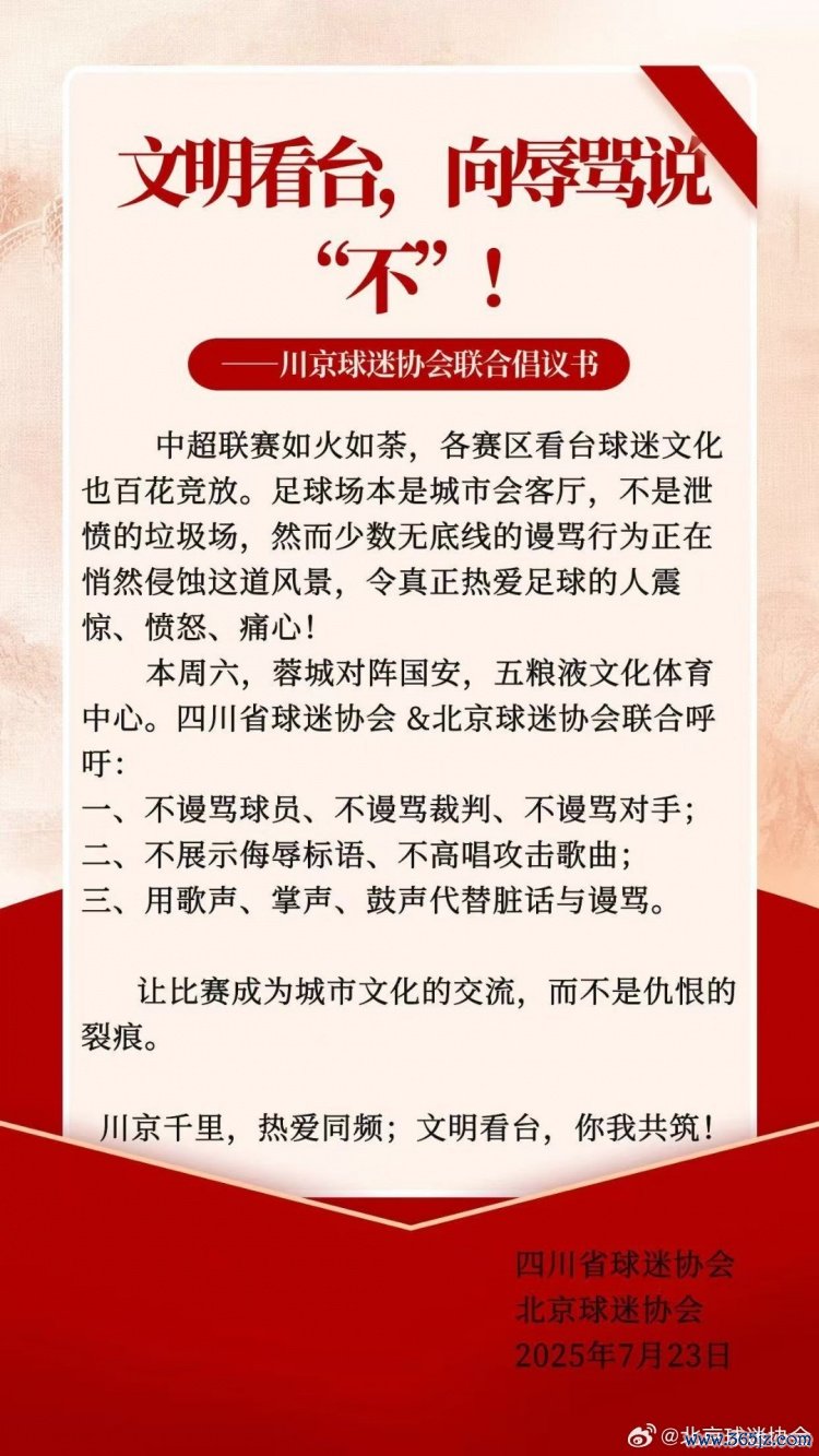 7月26日讯 今晚,中超联赛第18轮,成皆蓉城将在主场对阵北京国安。赛前,川京球迷协会探究倡议书:漂后看台,向追悼说“不”!