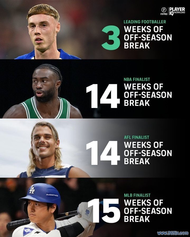 敷陈指出,又名顶级足球理解员的休赛期仅为3周,而比拟之下,插足NBA总决赛的篮球理解员、AFL决赛的澳式橄榄球理解员以及MLB决赛的棒球理解员,其休赛期诀别长达14周、14周和15周。