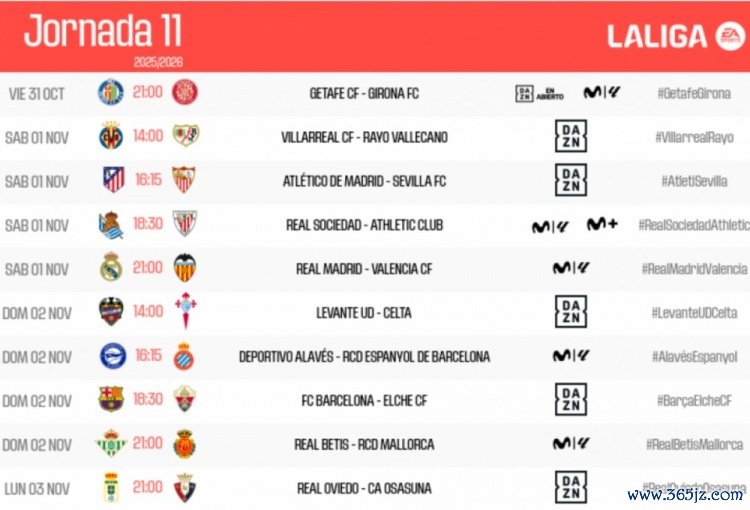 10月1日讯 今天,西甲联赛在官网公布了第11轮赛程,皇马和巴萨分辩在主场对阵瓦伦西亚和埃尔切。