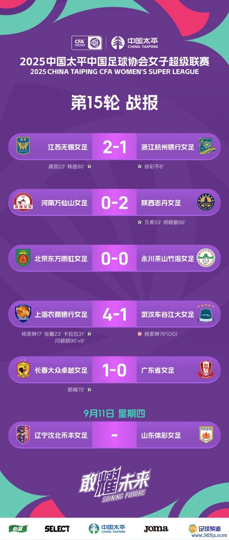 2025女超联赛第15轮战报、积分榜、弓手榜