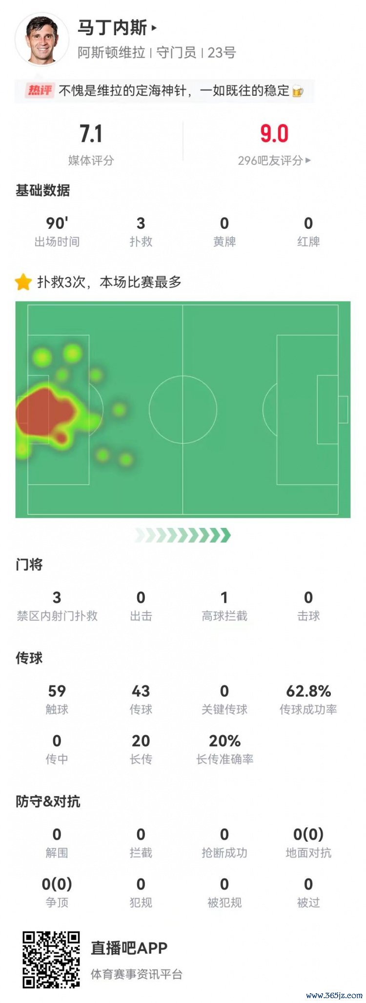10月27日讯 曼城在本轮英超焦点战0-1不敌维拉,门将马丁内斯本场数据如下: