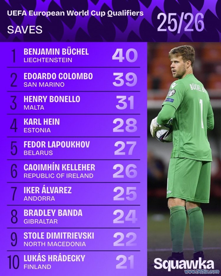 11月20日讯 Squawka统计世欧预各队门将扑救次数,列支敦士登门将本杰明·布歇尔40次居首。