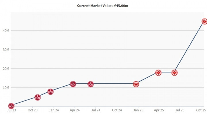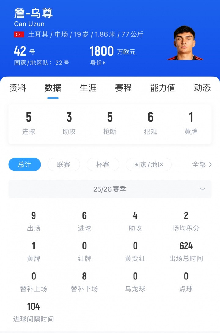 乌尊现年19岁,司职前腰,身高1.86米,法兰克福2024年破耗1100万欧将其从纽伦堡签下。本赛季,他为法兰克福出场9次,孝敬6球4助,他此前身价为1800万欧。