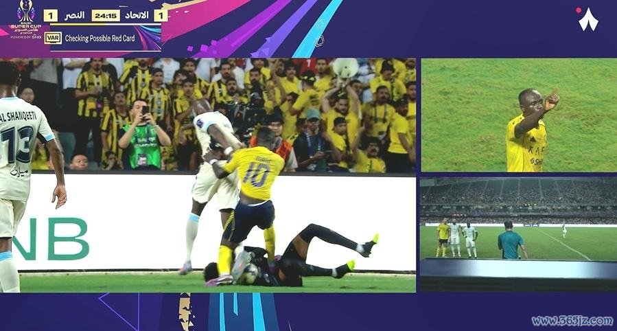 第24分钟戏剧性一幕出现了,吉达聚拢后卫佩雷拉将球护球给门将,效果马内从后纠缠,临了伸脚踩到吉达聚拢门将沙奇迪的肚子。一运转,主裁只是出示黄牌,但随后VAR介入,主裁最终将黄牌改成红牌。