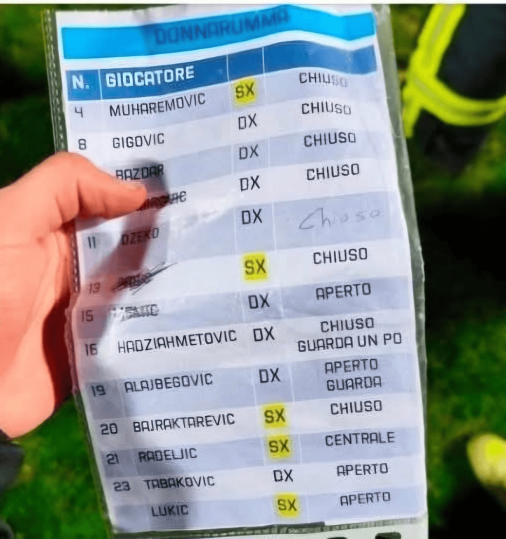 他晒出了一张意大利指导教练员组为多纳鲁马准备的罚球决胜 “小抄”,并表示:这是意大利队为多纳鲁马准备的十二码球手名单,波黑守门员偷走了它,这导致两名守门员在第一个十二码球后在古代足球 门 后发生争执。
