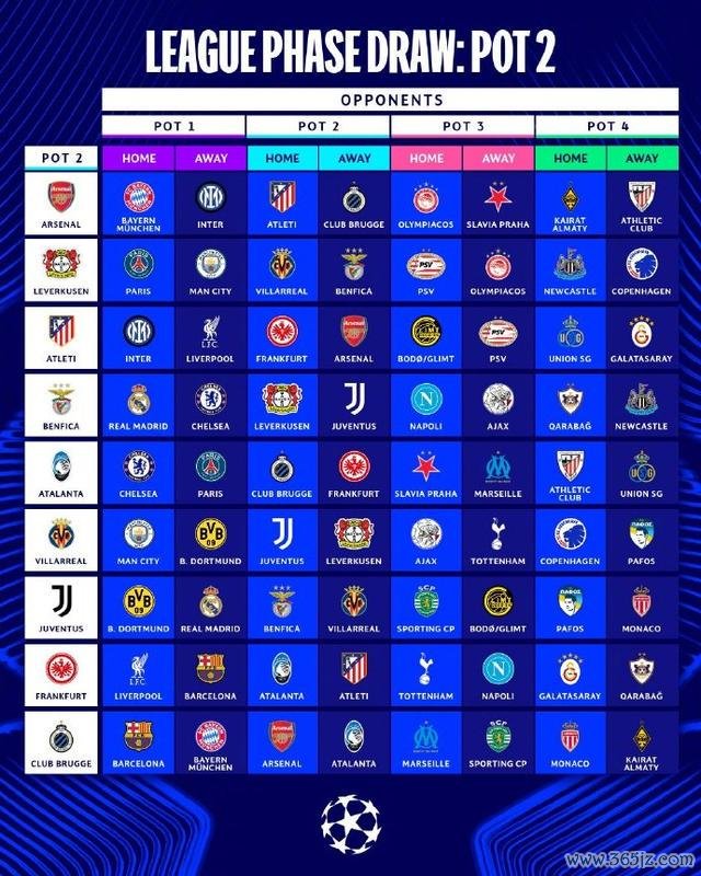 拜仁慕尼黑敌手:切尔西(主)、巴黎圣日耳曼(客)、布鲁日(主)、阿森纳(客)、葡萄牙体育(主)、埃因霍温(客)、圣吉罗斯(主)、帕福斯(客)
