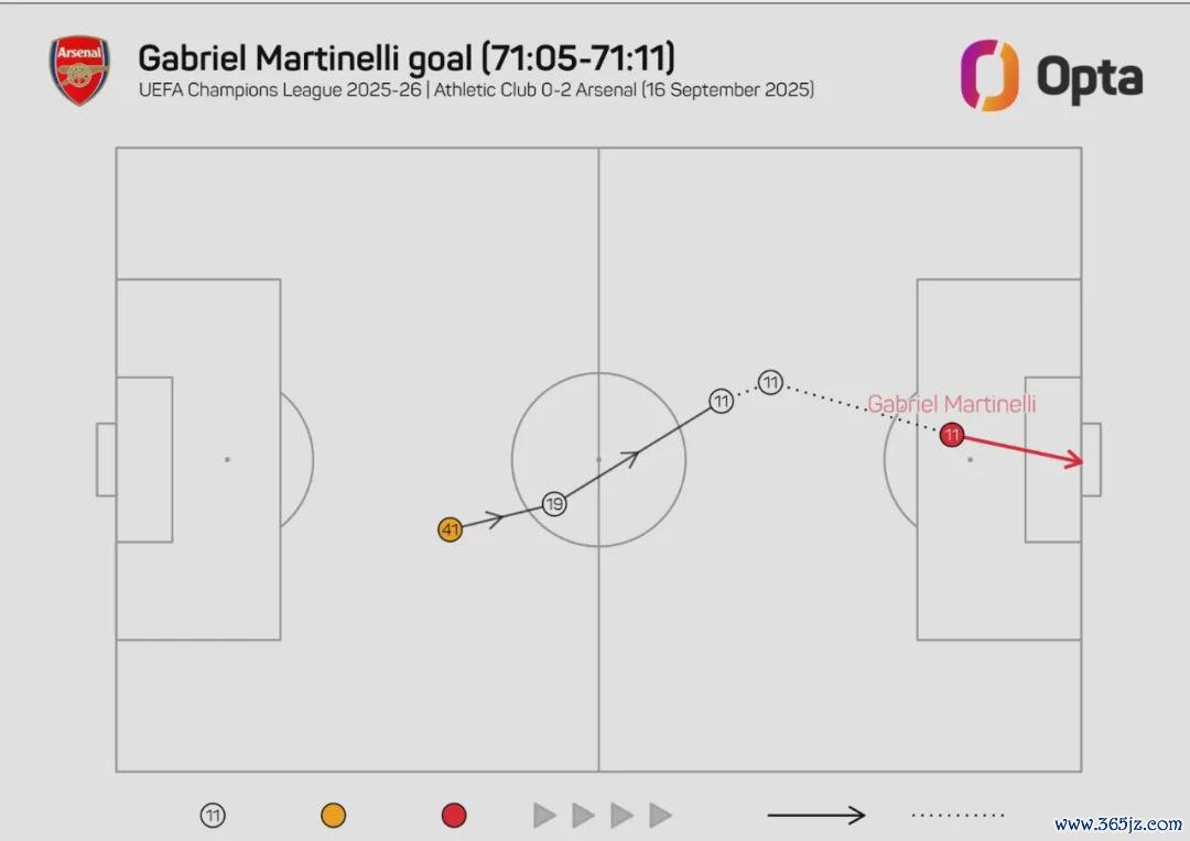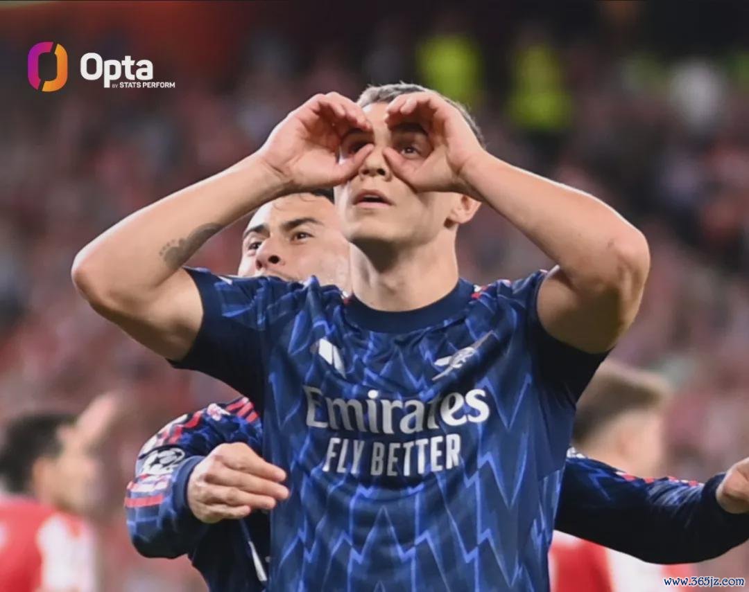 Opta统计,马丁内利在替补登场36秒后就为阿森纳打进了首球,这亦然枪手在欧冠历史上替补球员登场后的最快进球。