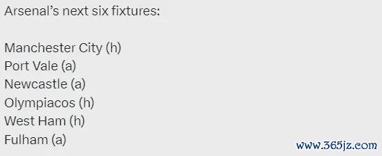 阿森纳将来6场比赛:主战曼城、客战韦尔港、客战纽卡斯尔、主战奥林匹亚科斯、主战西汉姆、客战富勒姆。