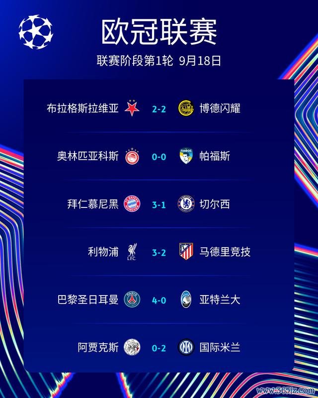 至此,25-26赛季欧冠联赛阶段第1轮,9月18日的6场比赛战罢:布拉格斯拉维亚2-2博德耀眼、奥林匹亚科斯0-0帕福斯、拜仁慕尼黑3-1切尔西、利物浦3-2马德里竞技、巴黎圣日耳曼4-0亚特兰大、阿贾克斯0-2外洋米兰!
