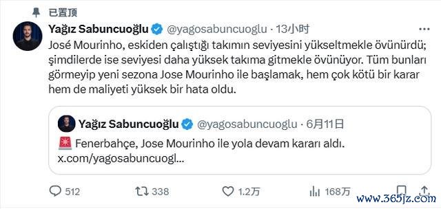 土耳其名记Yağız Sabuncuoğlu发文品评穆里尼奥并置顶推文:穆里尼奥还是时时以教化球队水平为荣,如今他却以加盟更高水平的球队自诩。