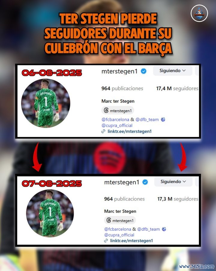 直播吧08月07日讯特尔施特根与巴萨之间的温情愈演愈烈,据西班牙六台音问,特尔施特根的社媒在一天内掉了10万粉丝。