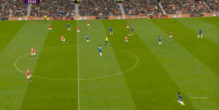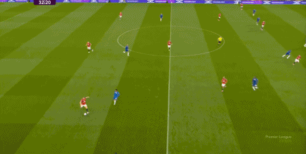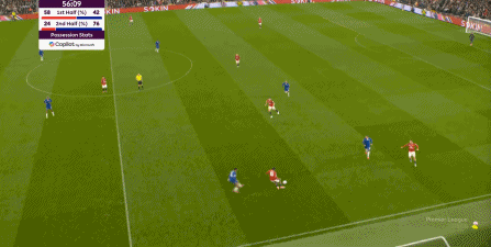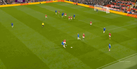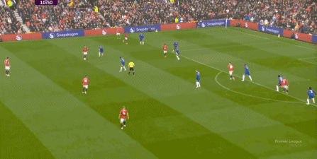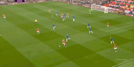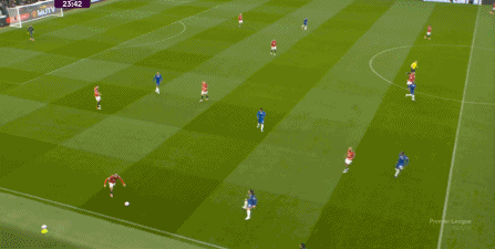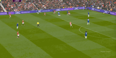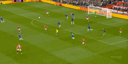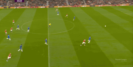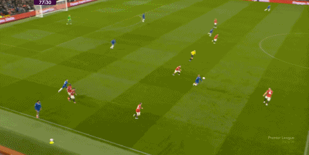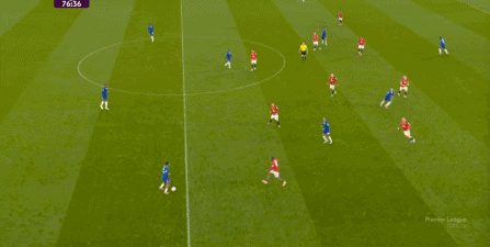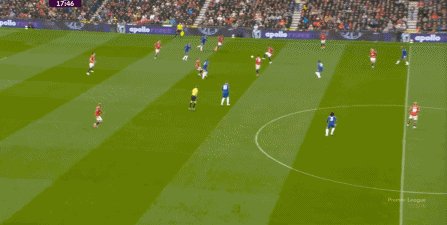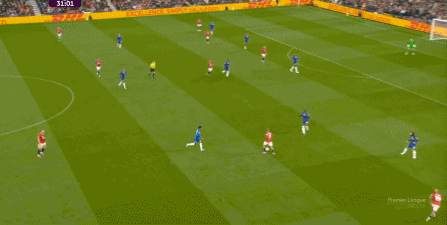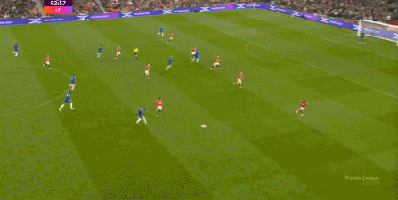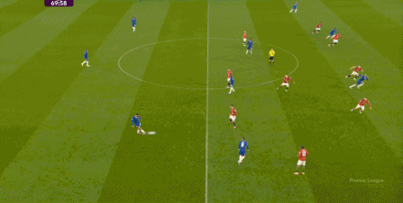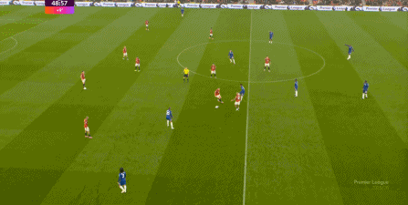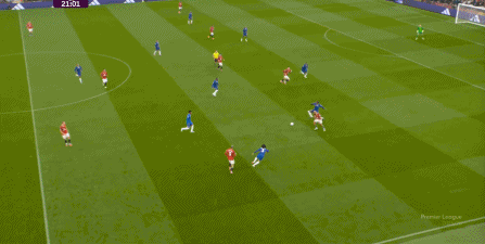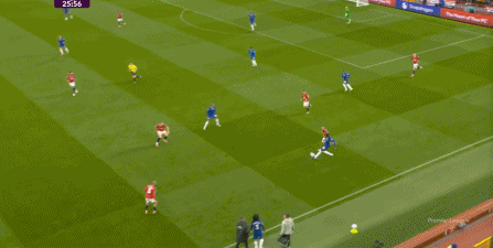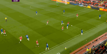 尤其是在第62分钟,濒临曼联后场的大脚球,切尔西先是在后场力压姆贝乌莫,回收球权,随后快速收拢曼联在这一侧中场和后卫之间的空当,打出了最应该让曼联有所警悟的一次要紧: