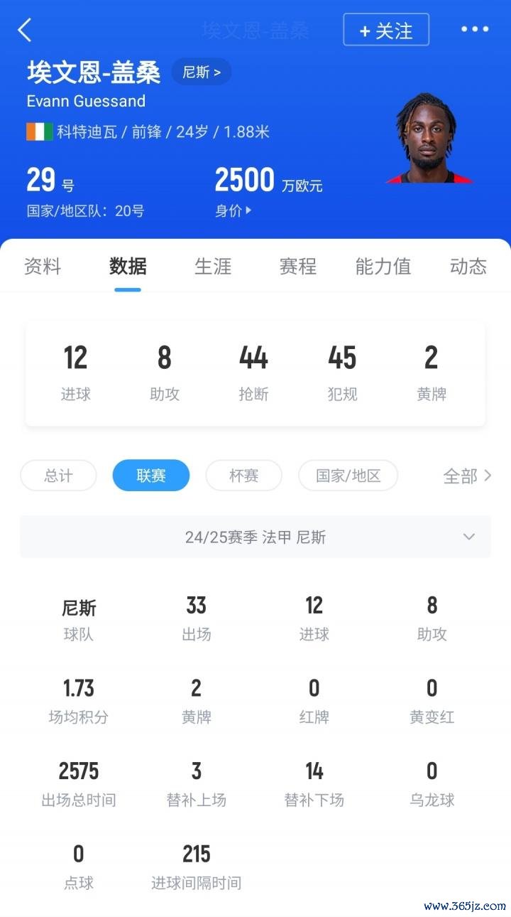 盖桑现年24岁,科特迪瓦籍,司职中锋、边锋,上赛季出战42场13球9助攻,德回身价2500万欧。