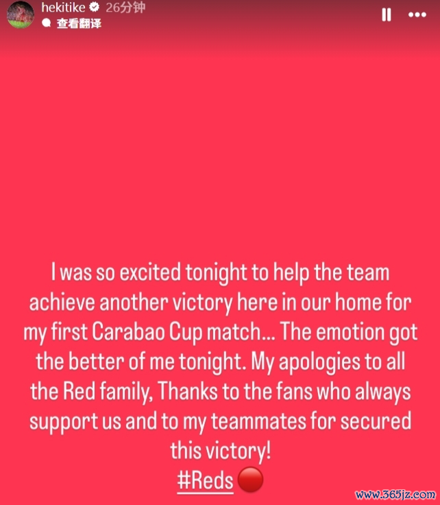 赛后,埃基蒂克在社媒向利物浦球迷说念歉:“今晚能初度进入联赛杯主场赛事并匡助球队再夺告捷,我无比情愿!但通宵豪情如实有些失控。在此向所有赤军公共庭致歉,也感谢一直赈济咱们的球迷,以及联袂赢下比赛的队友们!”