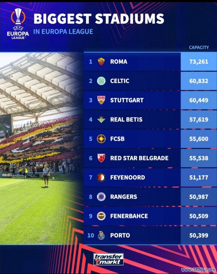 直播吧9月24日讯德转盘货了本赛季欧联杯参赛球队主场最大可上座东谈主数榜单,其中罗马主场居首,具体榜单如下: