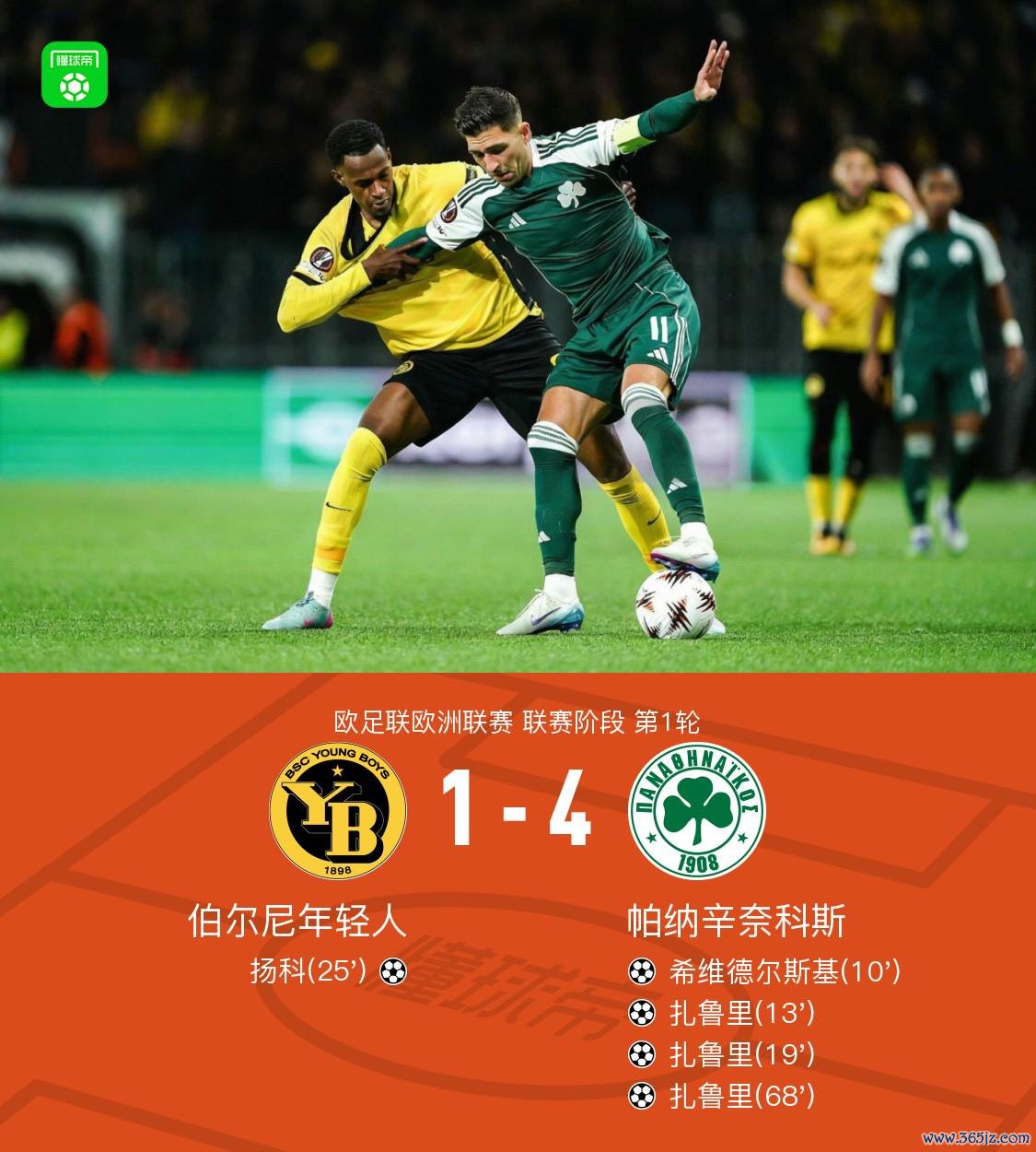 北京时刻9月26日欧足联欧洲联赛 联赛阶段 第1轮,伯尔尼年青东说念主对阵帕纳辛奈科斯。伯尔尼年青东说念主扬科破门。帕纳辛奈科斯希维德尔斯基破门,扎鲁里帽子戏法。最终比分伯尔尼年青东说念主 1-4 帕纳辛奈科斯。