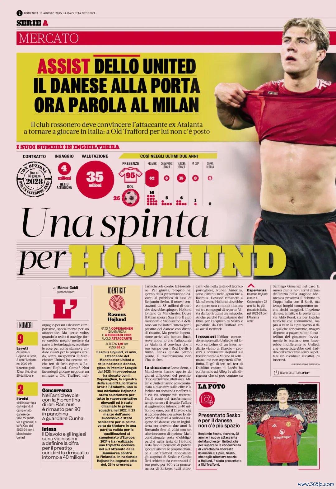 霍伊伦德在2023年以7500万欧元转会费从亚特兰大加盟,还有1000万欧元的浮动条件,他签约5年,目下还有3年的合同。他被觉得照旧不愿意地给与了我方不得不离开的执行,米兰当今有契机劝服他加盟。
