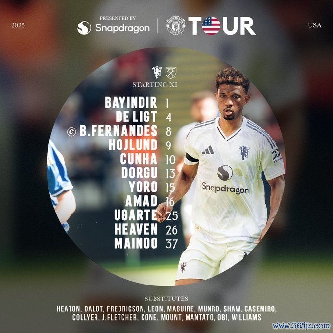 曼联首发:1-巴因德尔、13-多古、4-德里赫特、15-约罗、26-海文、25-乌加特、37-梅努、8-B费、9-霍伊伦、10-库尼亚、16-阿玛德-迪亚洛