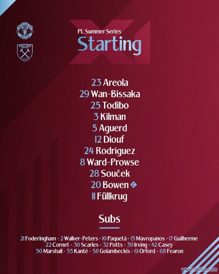 西汉姆首发:23-阿雷奥拉、3-基尔曼、5-阿格德、8-沃德普劳斯、11-菲尔克鲁格、12-迪乌夫、20-鲍文、24-圭多-罗德里格斯、25-托迪博、28-绍切克、29-万比萨卡