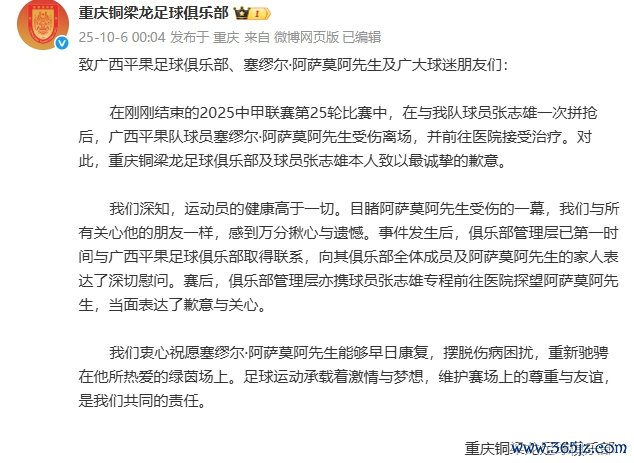 在刚刚戒指的2025中甲联赛第25轮比赛中,在与我队球员张志雄一次拼抢后,广西平果队球员塞缪尔·阿萨莫阿先生受伤离场,并前去病院禁受调养。对此,重庆铜梁龙足球俱乐部及球员张志雄本东说念主致以最赤诚的歉意。