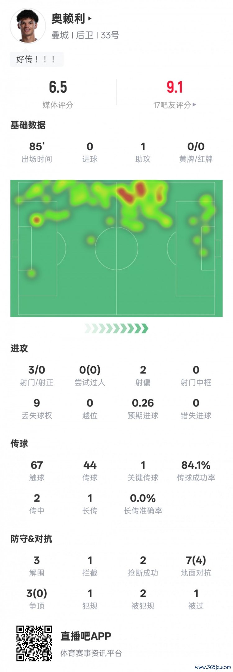 10月18日讯 2025-26赛季英超联赛第8轮,曼城对阵埃弗顿。奥赖利首发出战,送出1次助攻,1次要津传球,还有3突围2抢断,评分6.5。