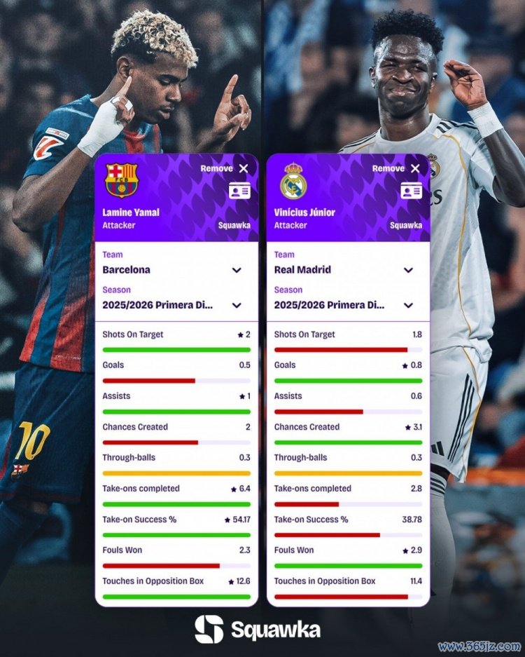 10月25日讯 皇马和巴萨将在本轮西甲焦点对决,数据机构squakwa对比了亚马尔与维尼修斯在2025/26赛季西甲关键数据(加粗项为上风数据):