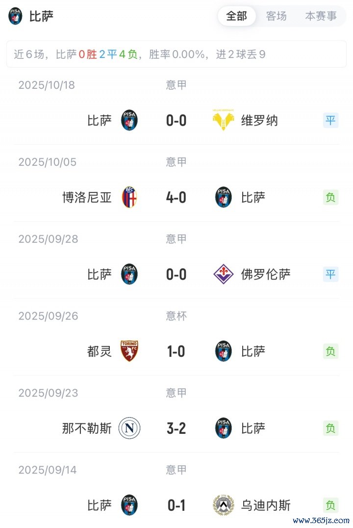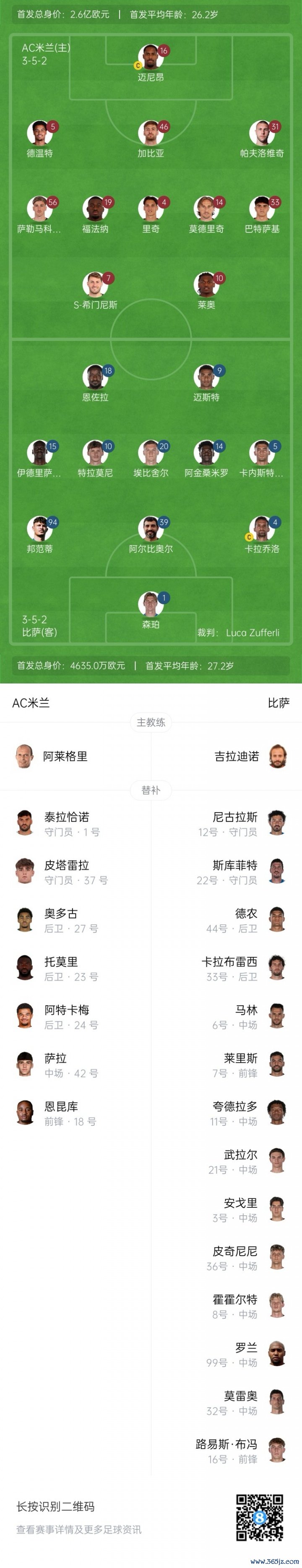比萨首发:1-森帕、4-卡拉乔洛、39-阿尔比奥尔、5-卡内斯特雷利、15-伊德里萨·图雷、14-阿金桑米罗、20-埃比舍尔、94-邦范蒂、10-特拉莫尼、9-迈斯特、18-恩佐拉