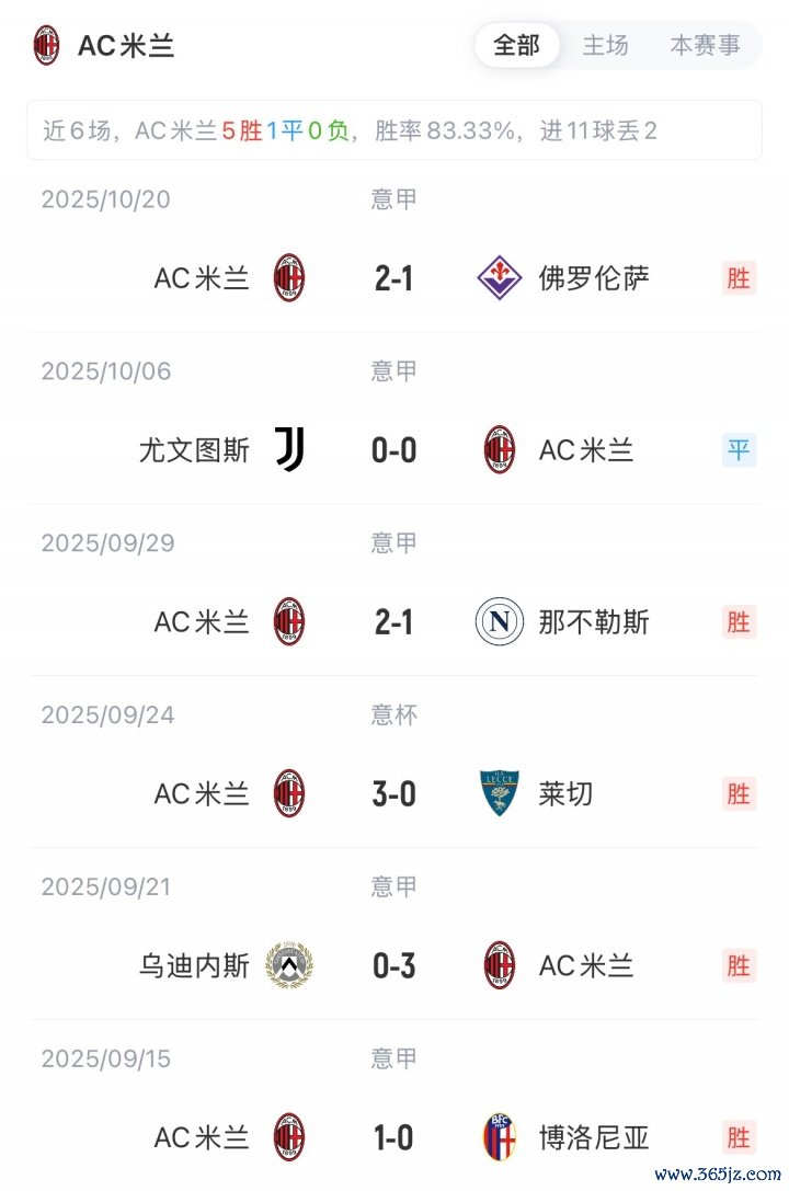 米兰5胜1平1负暂以16分领跑意甲,比萨3平4负排行垫底。