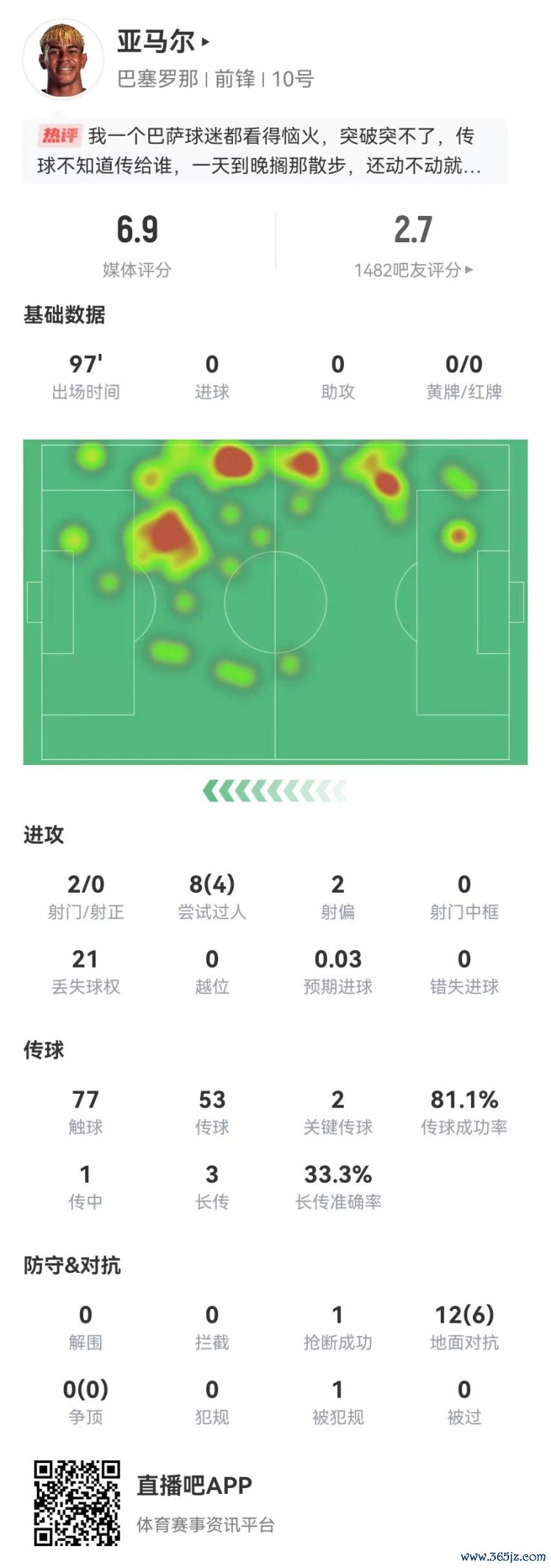 10月27日讯 皇马在本轮西甲焦点战力克巴萨,亚马尔本场数据如下:
