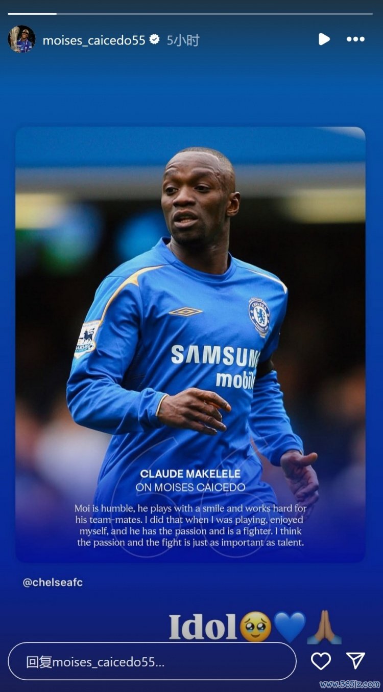 蓝军名宿马克莱莱近日在采访中赞好意思凯塞多,切尔西发布了他的采访片断,凯塞多转发关系动态,配文:“偶像。”