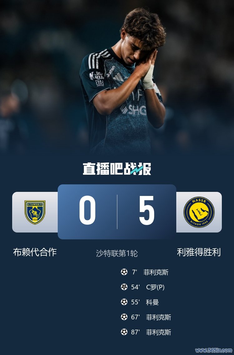 沙特联第一轮,菲利克斯帽子戏法,C罗、科曼进球,利雅取得手5-0大捷布赖代相助。