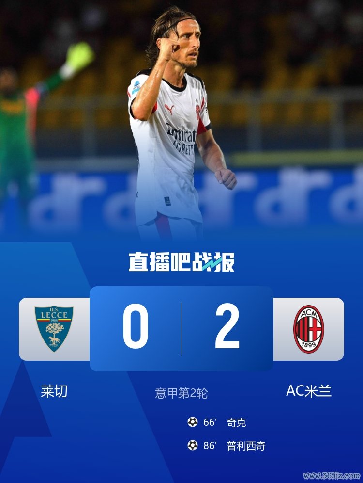 意甲第2轮,AC米兰2-0投诚莱切,奇克、普利西奇进球。