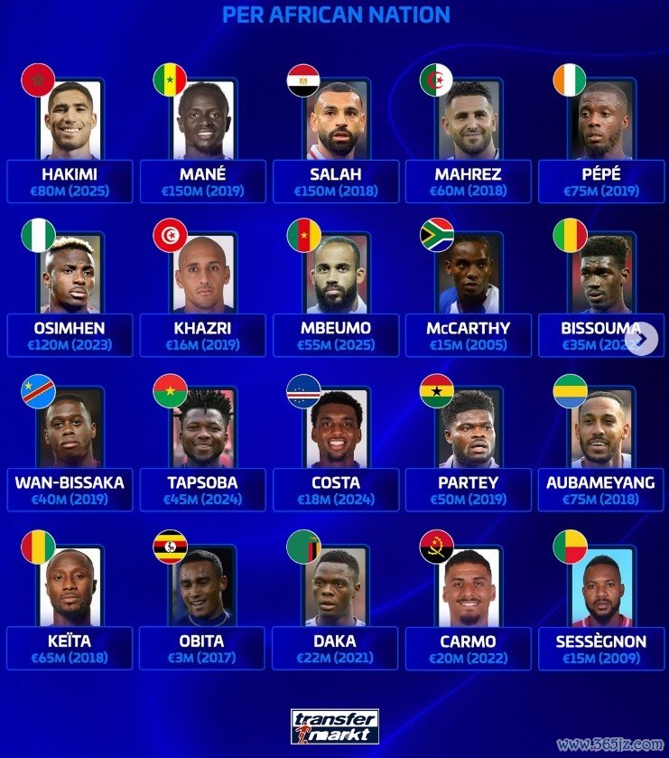 10月14日讯 德国转会市集清点了非洲列国球员历史身价记载,萨拉赫和马内以1.5亿欧比肩非洲历史身价最高球员。