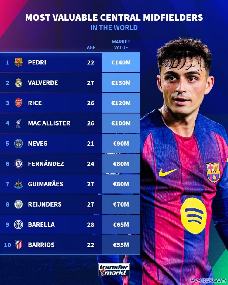 11月2日讯 德国转会阛阓列出了中场中路球员(Central Midfielders)身价排行,佩德里、巴尔韦德、赖斯前三。