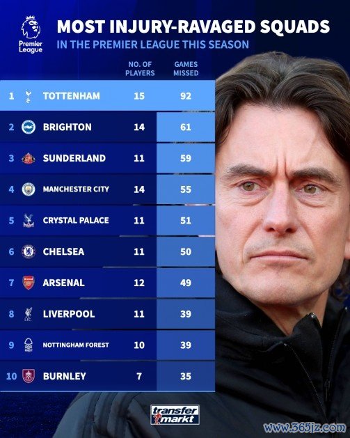 11月25日讯 德转列本赛季英超球队伤病榜,热刺15东说念主次受伤,共计缺席92场比赛排行第一,布莱顿、桑德兰位列二三位。