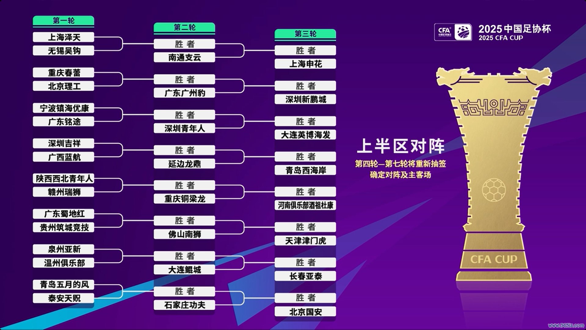 2025中国足协杯正赛将于3月14日开赛,12月5日落幕。一共进行7轮比赛,为主客场单败淘汰赛制。第1轮至第3轮若在90分钟内战平将径直进行点球大战,决赛将于12月5日在苏州奥体中心进行。