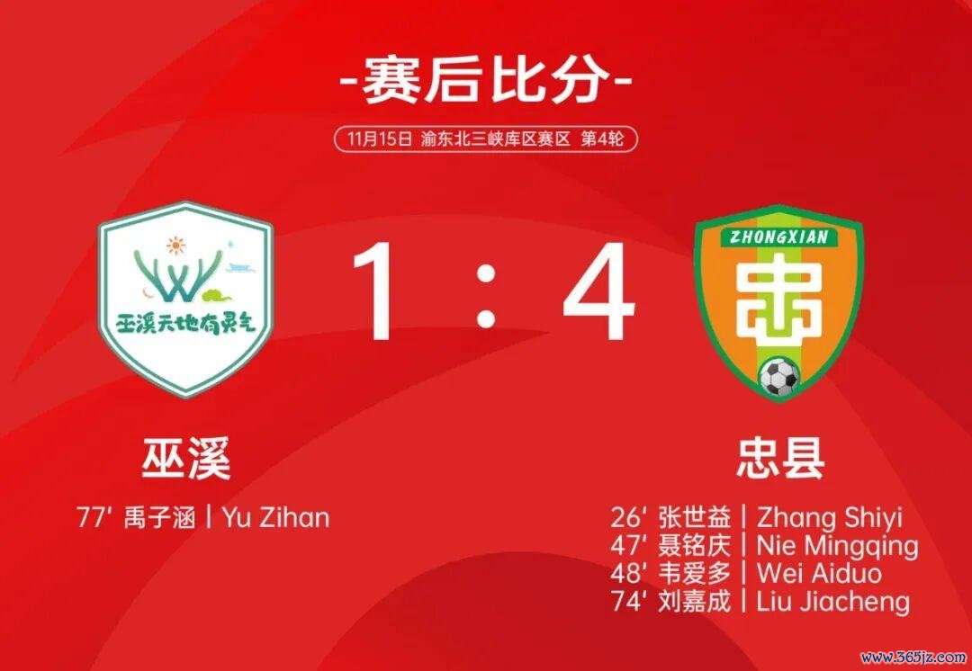 第26分钟,忠县取得角球契机,58号球员张世益高高跃起,头球破门,为客场取得跨越。第47分钟,24号球员聂铭庆小角度左脚再进一球,匡助忠县客场2:0跨越。只是1分钟之后,26番外卡球员韦爱多左脚劲射,皮球击中左侧立柱破门,3:0。第74分钟,41号刘嘉成后点包抄平直,4:0。第77分钟,巫溪77号球员禹子涵径直淘气球破门,匡助球队扳回一球,将比分锁定为1:4。